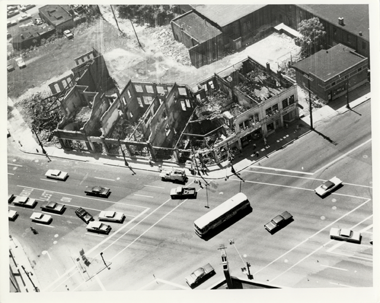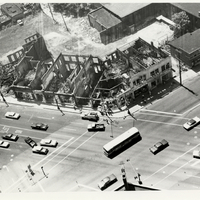 - Bird's-eye view of buildings at Warren and Grand River destroyed by fire during 1967 riots in Detroit. Handwritten on back: "Warren & Gd. River."