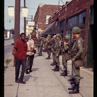This evocative color 35mm slide taken by artist Henri Umbaji King captures a striking moment during the events of July 1967 on Charlevoix Street, blending the innocence of youth with the heavy presence of military authority. In the foreground, three African American boys pause to glance back at the camera, their expressions reflecting curiosity and unease amid the turmoil. Alongside them, soldiers from the U.S. Army's 82nd Airborne Division stand in formation on the sidewalk, their presence underscoring the severity of the unrest. In the background, storefront signs for Marshall Hardware Company, a record store, and a party store offer glimpses of the neighborhood’s everyday life disrupted by the events. This image juxtaposes the vibrancy of local community spaces with the imposing reality of military intervention, serving as a poignant reminder of the profound impact of the 1967 Detroit riots on the city’s people and landscape.