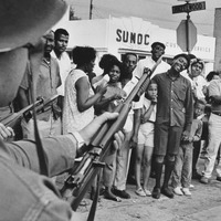 Photograph of a national guardsman pointing a weapon at a group of African Americans standing in a line on Linwood Avenue and Hazelwood.
