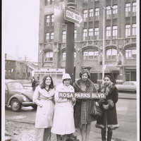 Raymond Parks, a civil rights activist, barber, and husband of Rosa Parks, owned a barbershop that was looted during the unrest. Both he and Rosa were deeply affected by the destruction. In response, Detroit residents petitioned to rename the street in her honor. On July 14, 1976, Twelfth Street was officially renamed Rosa L. Parks Boulevard during a ribbon-cutting ceremony led by Mayor Coleman Young. The photo depicts Rosa Parks alongside Louise Tappes, Mary Sims, and an unknown reporter at the event.