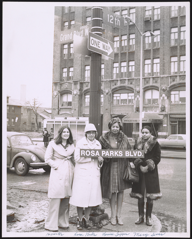 Raymond Parks, a civil rights activist, barber, and husband of Rosa Parks, owned a barbershop that was looted during the unrest. Both he and Rosa were deeply affected by the destruction. In response, Detroit residents petitioned to rename the street in her honor. On July 14, 1976, Twelfth Street was officially renamed Rosa L. Parks Boulevard during a ribbon-cutting ceremony led by Mayor Coleman Young. The photo depicts Rosa Parks alongside Louise Tappes, Mary Sims, and an unknown reporter at the event.