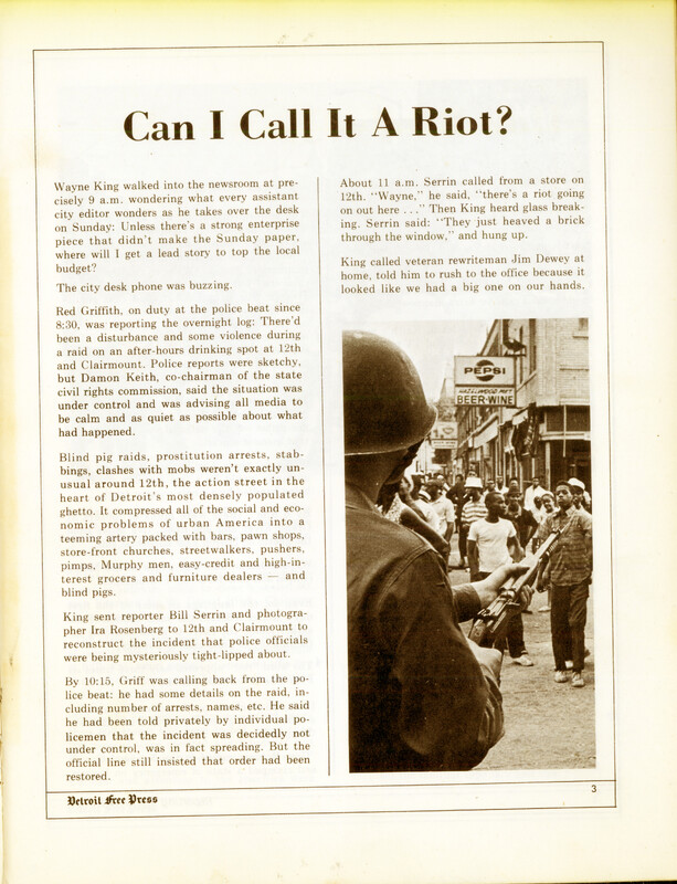 Materials in this online archive have been arranged in chronological order and by topic. This was done to educate users about the events that unfolded in the Summer of 1967 in Detroit. However, given that several repositories were drawn from in order to populate this site, there is little to no collection-level original order to maintain. The archivists responsible for creating this collection worked to ensure that each resource included in this archive has not been internally rearranged or altered. This primarily pertains to multi-page documents in which a user is able to view each document as a separate entity.