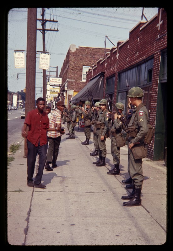 This evocative color 35mm slide taken by artist Henri Umbaji King captures a striking moment during the events of July 1967 on Charlevoix Street, blending the innocence of youth with the heavy presence of military authority. In the foreground, three African American boys pause to glance back at the camera, their expressions reflecting curiosity and unease amid the turmoil. Alongside them, soldiers from the U.S. Army's 82nd Airborne Division stand in formation on the sidewalk, their presence underscoring the severity of the unrest. In the background, storefront signs for Marshall Hardware Company, a record store, and a party store offer glimpses of the neighborhood’s everyday life disrupted by the events. This image juxtaposes the vibrancy of local community spaces with the imposing reality of military intervention, serving as a poignant reminder of the profound impact of the 1967 Detroit riots on the city’s people and landscape.