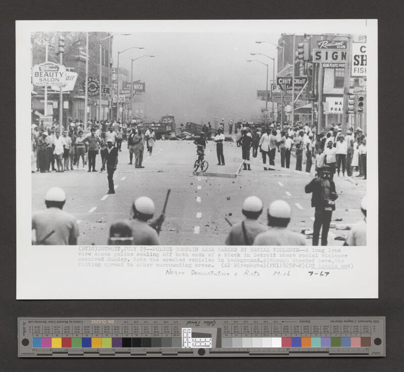 An image that depicts police sealing off both ends of a block in Detroit, with groups of Black Detroiters standing in the middle.