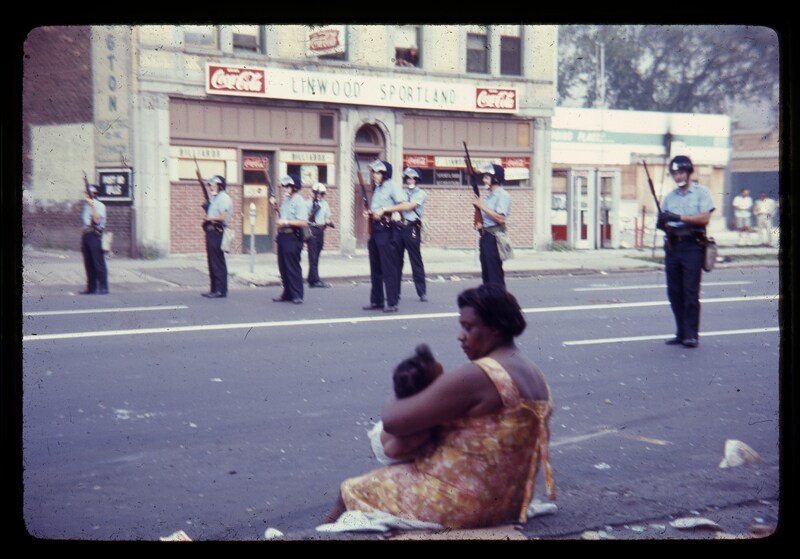This vivid color 35mm slide taken by artist Henri Umbaji King captures a poignant moment during the events of July 1967 on Linwood Avenue, offering a glimpse into the tension and resilience of the time. In the foreground, a Black woman cradles a child, embodying the protective instincts and human vulnerability amid the chaos. Across the street, a line of eight police officers, equipped with helmets and rifles, stands as a stark reminder of the forceful response to the unrest. Behind them, the boarded-up facade of Linwood Sportland and another shuttered building echo the disruptions to community life and commerce. This image encapsulates the complexities of the 1967 Detroit riots, juxtaposing scenes of familial tenderness with the rigid posture of authority, and serves as a testament to the enduring impact of these events on Detroit’s social and urban fabric.