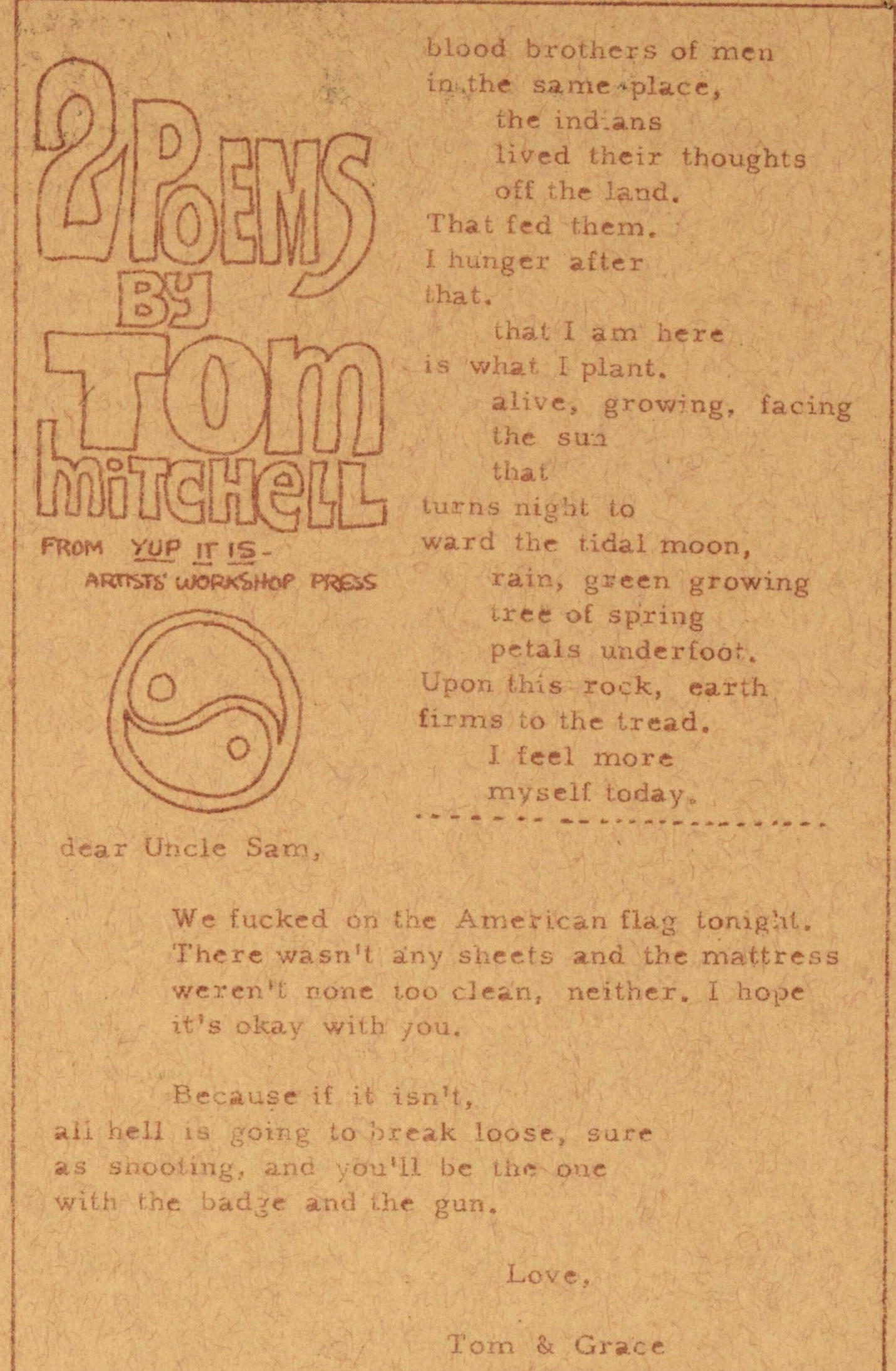 - Two poems written by Tom Mitchell published in a September 1967 edition of Ann Arbor Sun.
