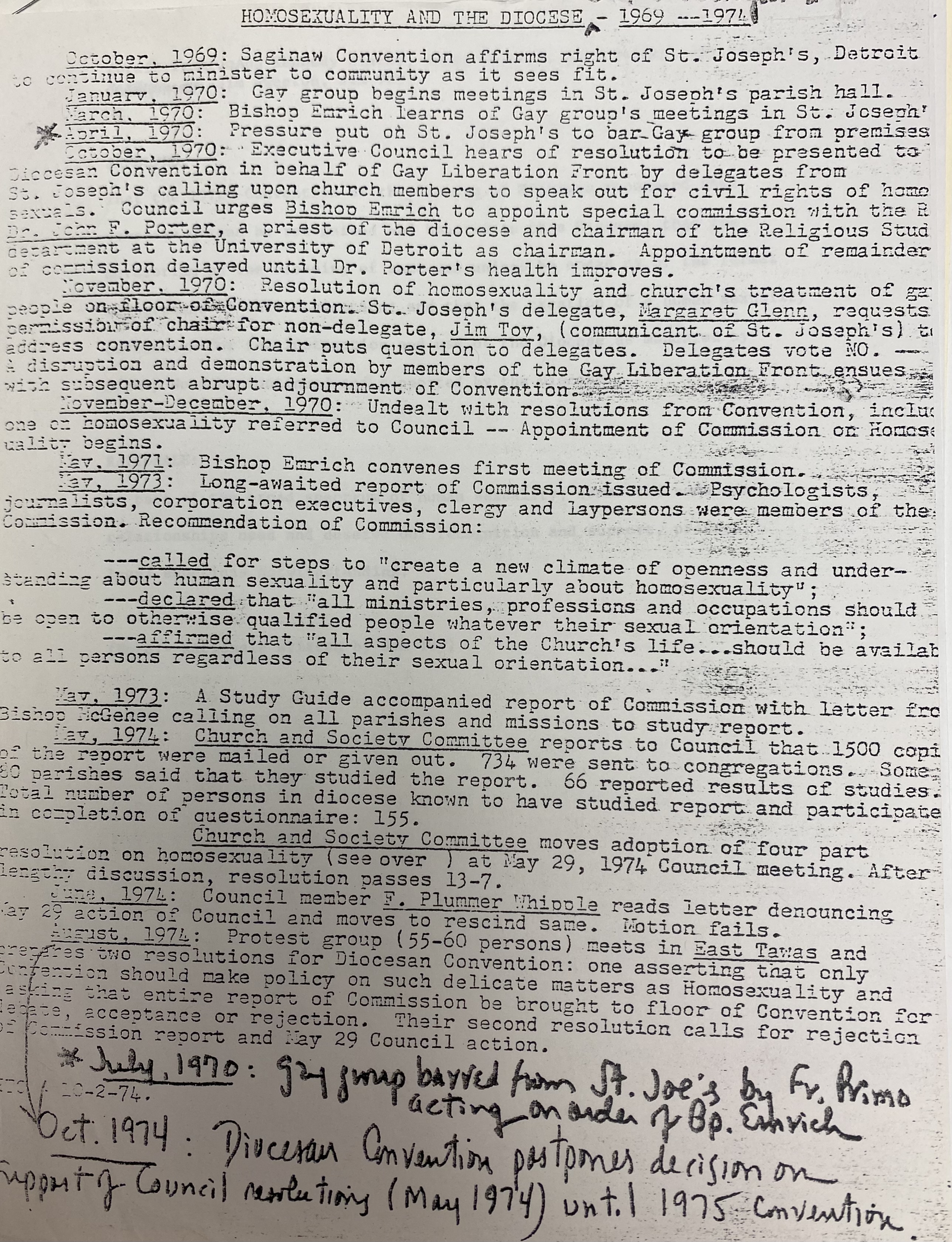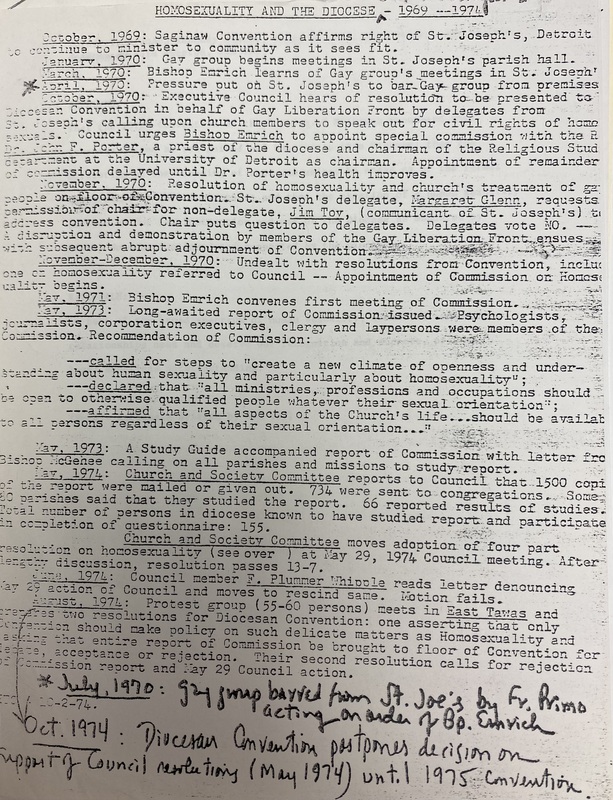A timeline of St. Mathew 's-St. Joseph's (St. Joseph's at the time) stance on homosexuality from October 1969 to August 1974. With marginalia.