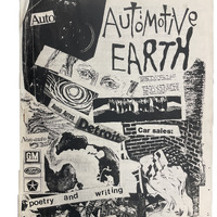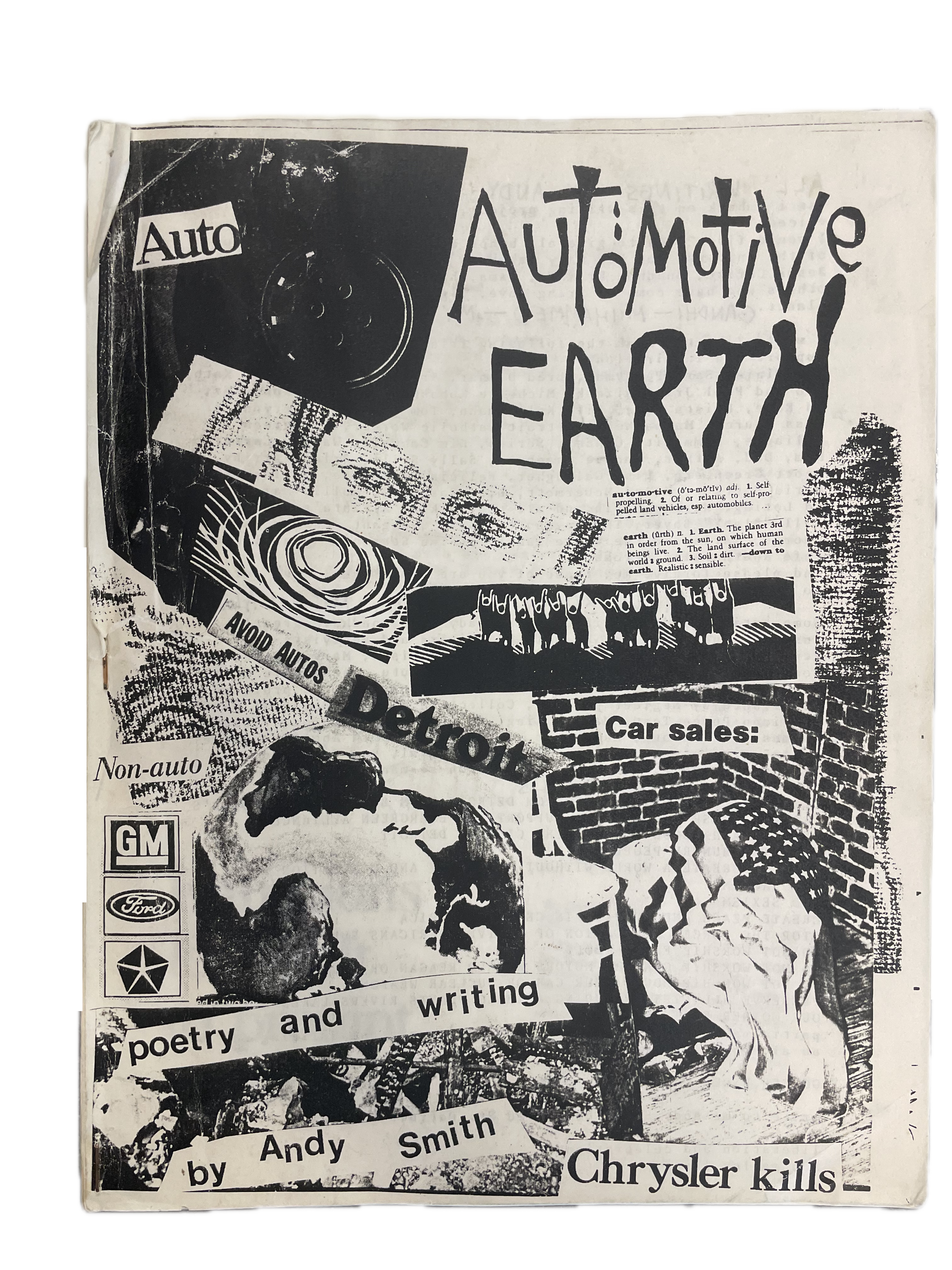Collage featuring cut out words and pictures with a theme on the Detroit automotive industry.