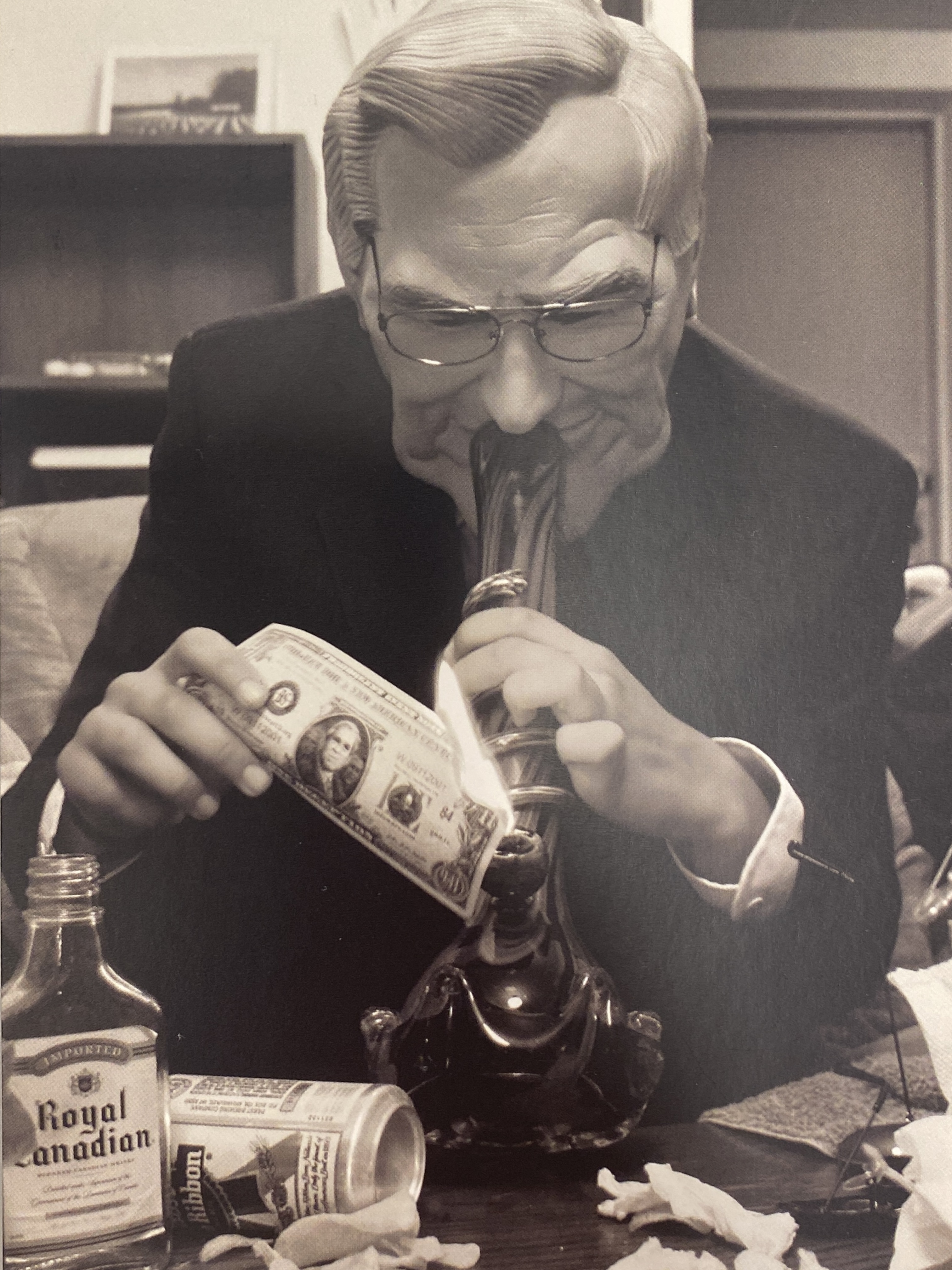 Picture of a man wearing a Dick Cheney mask lighting a bong with burning fake money.