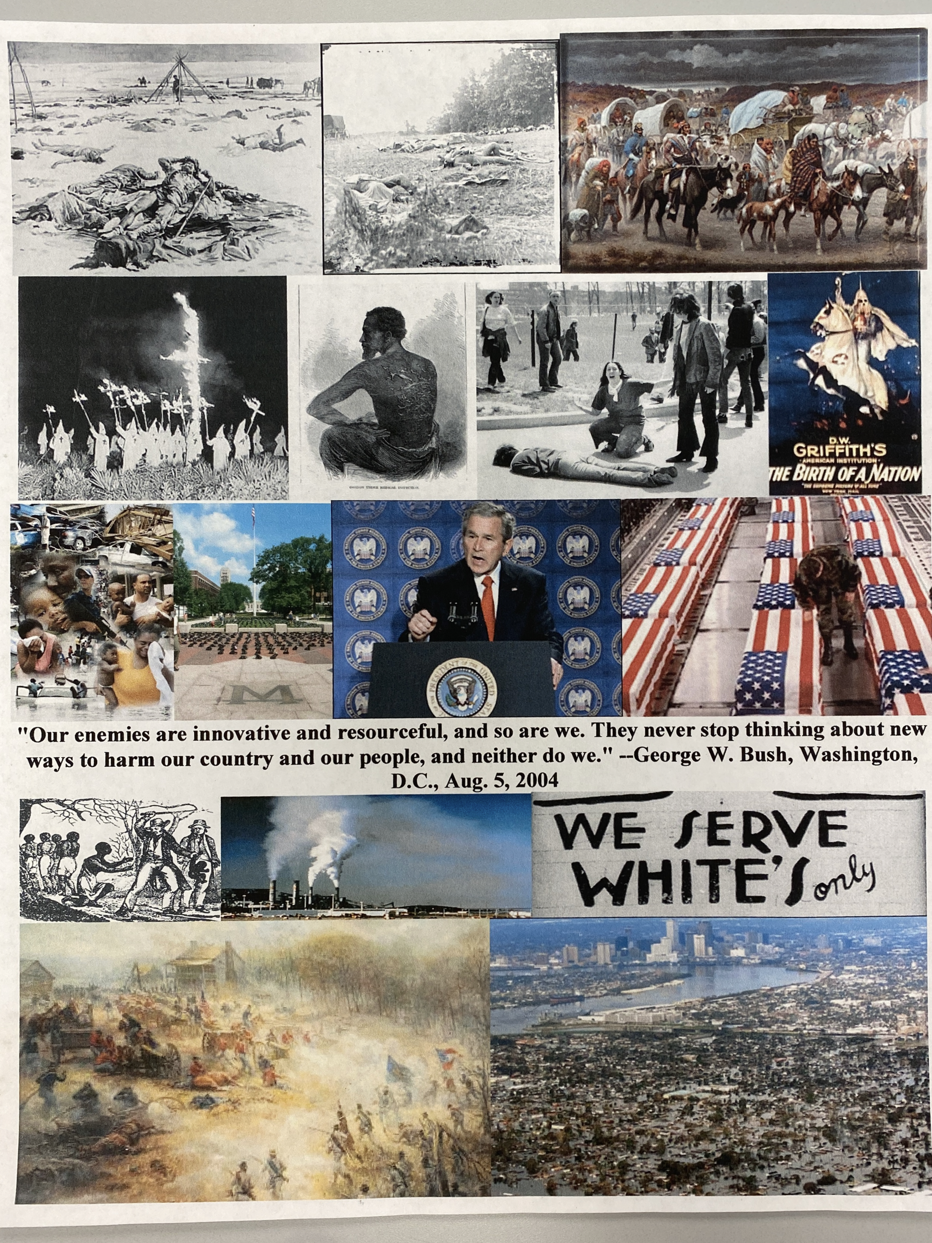 Collage work featuring photos and quote from George W. Bush, as well as photos from white supremacy groups such as the KKK, and other racist depictions.