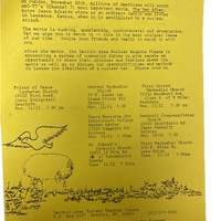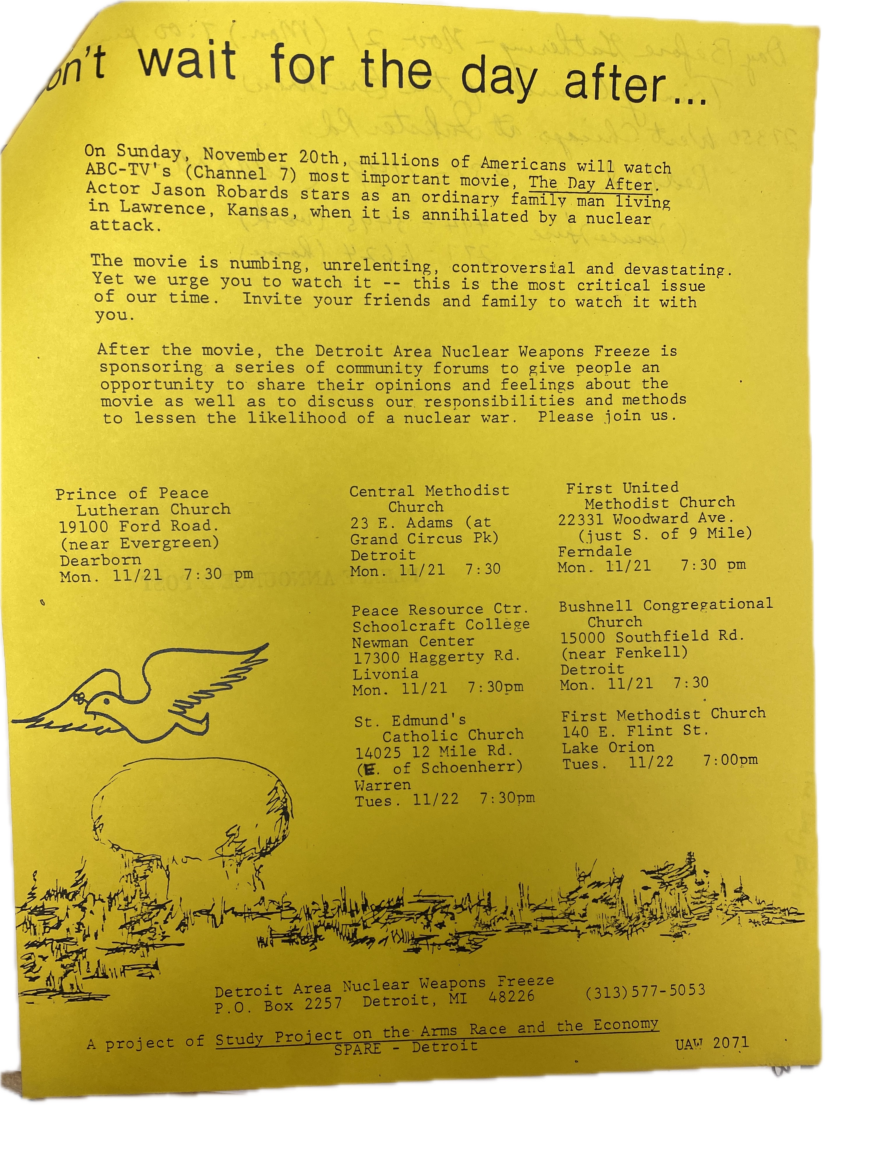 Flyer promoting community forums to discuss the movie "The Day After," which is about Nuclear Annihilation in the United States.