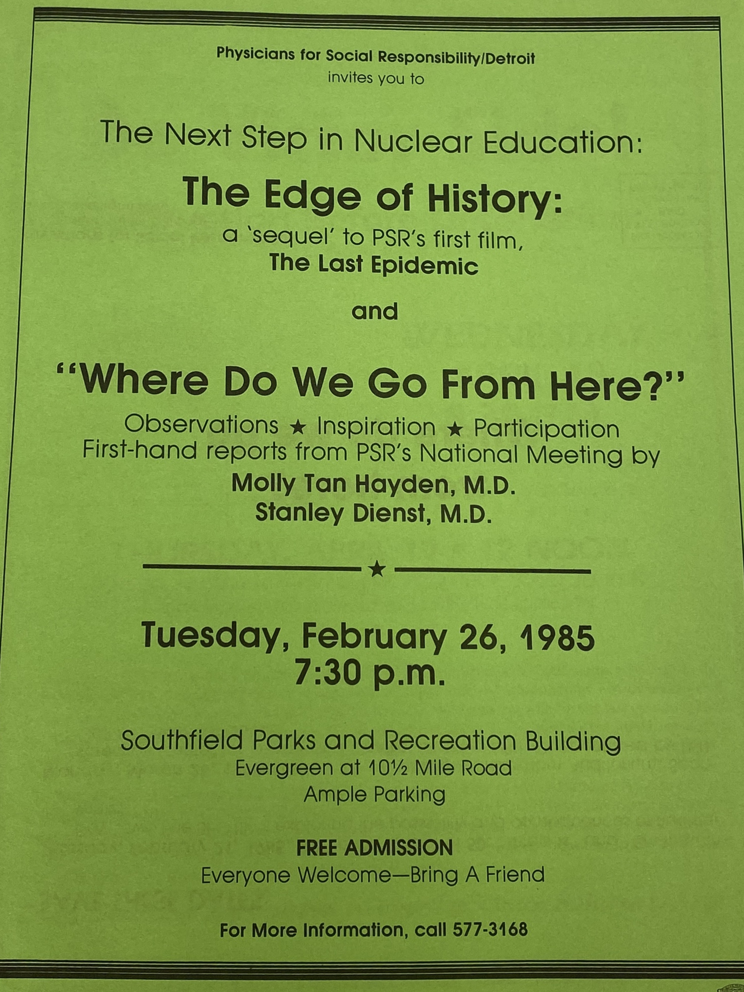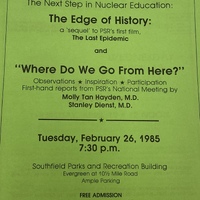 Flyer for a movie and a report from Physicians for Social Responsibility (PSR) - Detroit's representatives to the National PSR Meeting