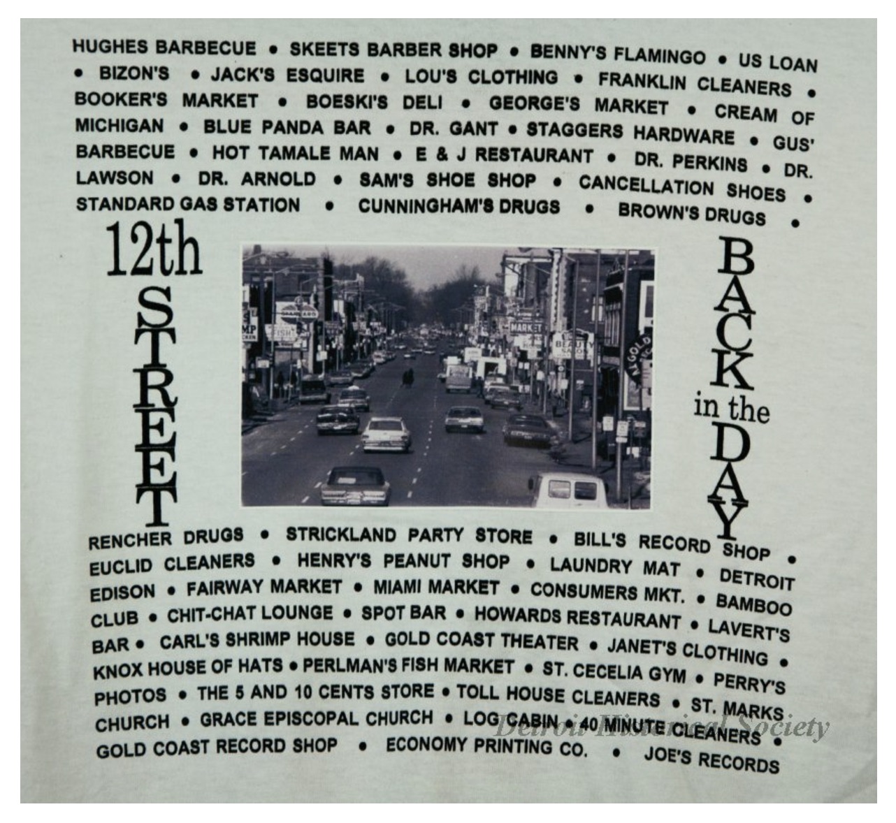 - T-shirt design commemorating the businesses that were destroyed on 12th St. during the 1967 Detroit Riots