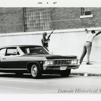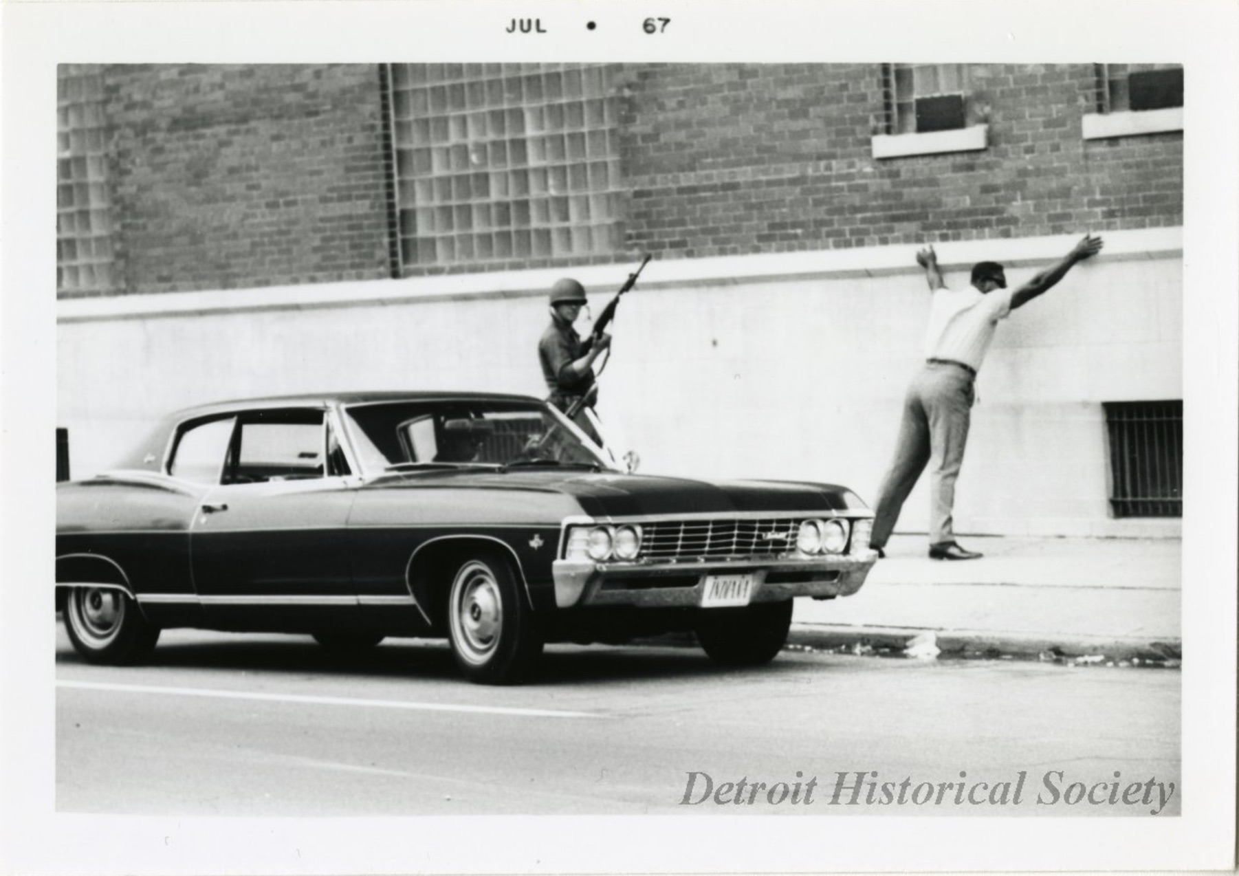 - Black and white photo of a National Guardsman and a man against the wall of a building, suggesting he is being detained and searched.