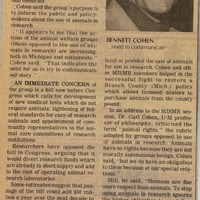 - The article reports on the formation of the Michigan Society for Medical Research at the University of Michigan, a group advocating for the continued use of animals in scientific research amid growing opposition from animal-welfare organizations and pending federal legislation. It highlights statements from Dr. Bennett Cohen and others arguing that animal research is essential, warning that proposed regulations would increase costs and hinder scientific progress.