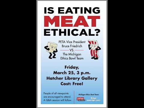 A poster, supplemental video, recording, and presentation slides from a meeting and subsequent debate hosted on 03.25.2011 by the Michigan Animal Rights Society. The event explored whether the act of eating meat and supporting the brutalities of the factory farming industry is ethical. Content warnings are included for materials that contain depictions of violence against animals.