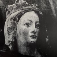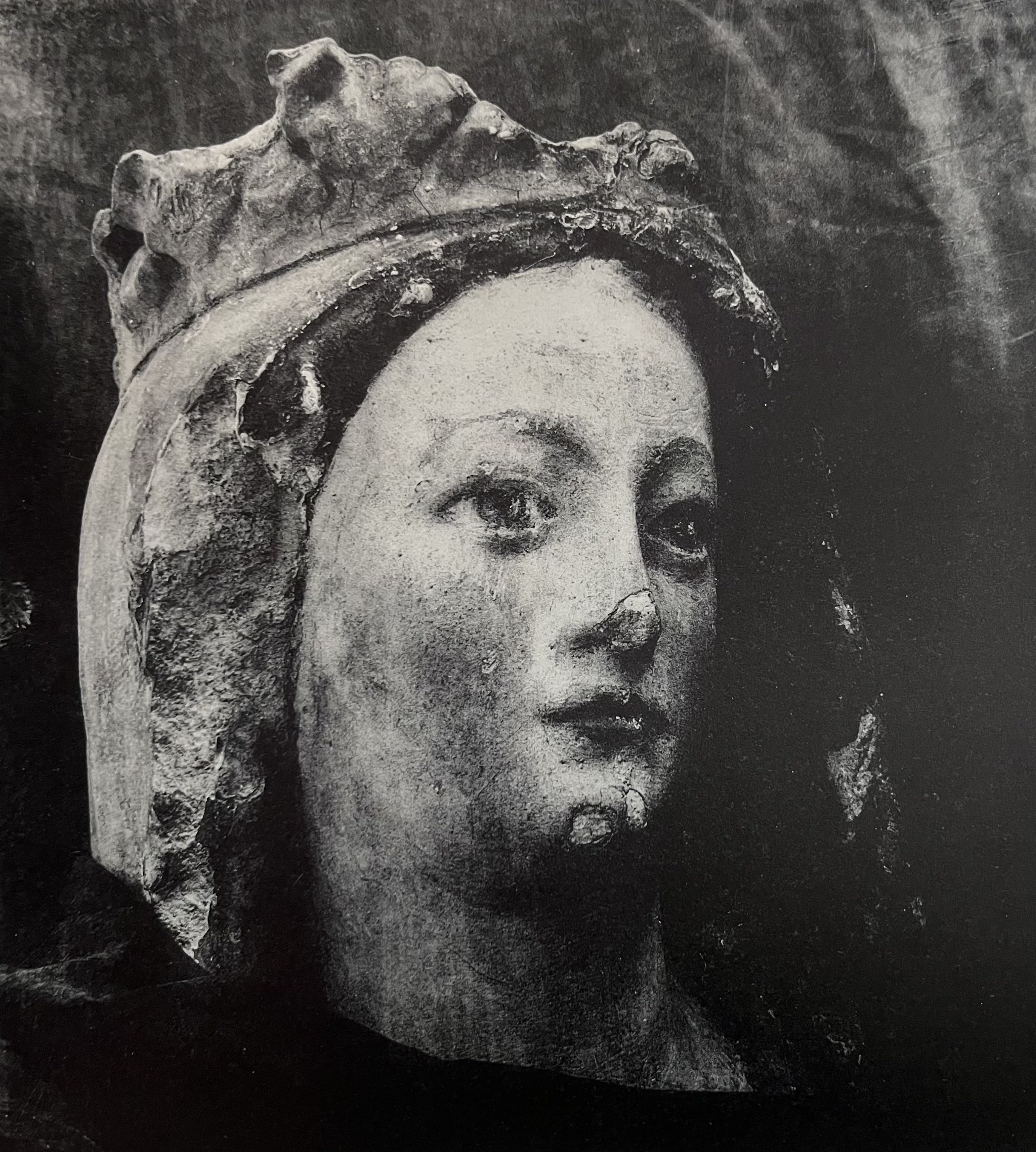 - A black and white photo. A close up image of the head of the Virgin and Child statue.