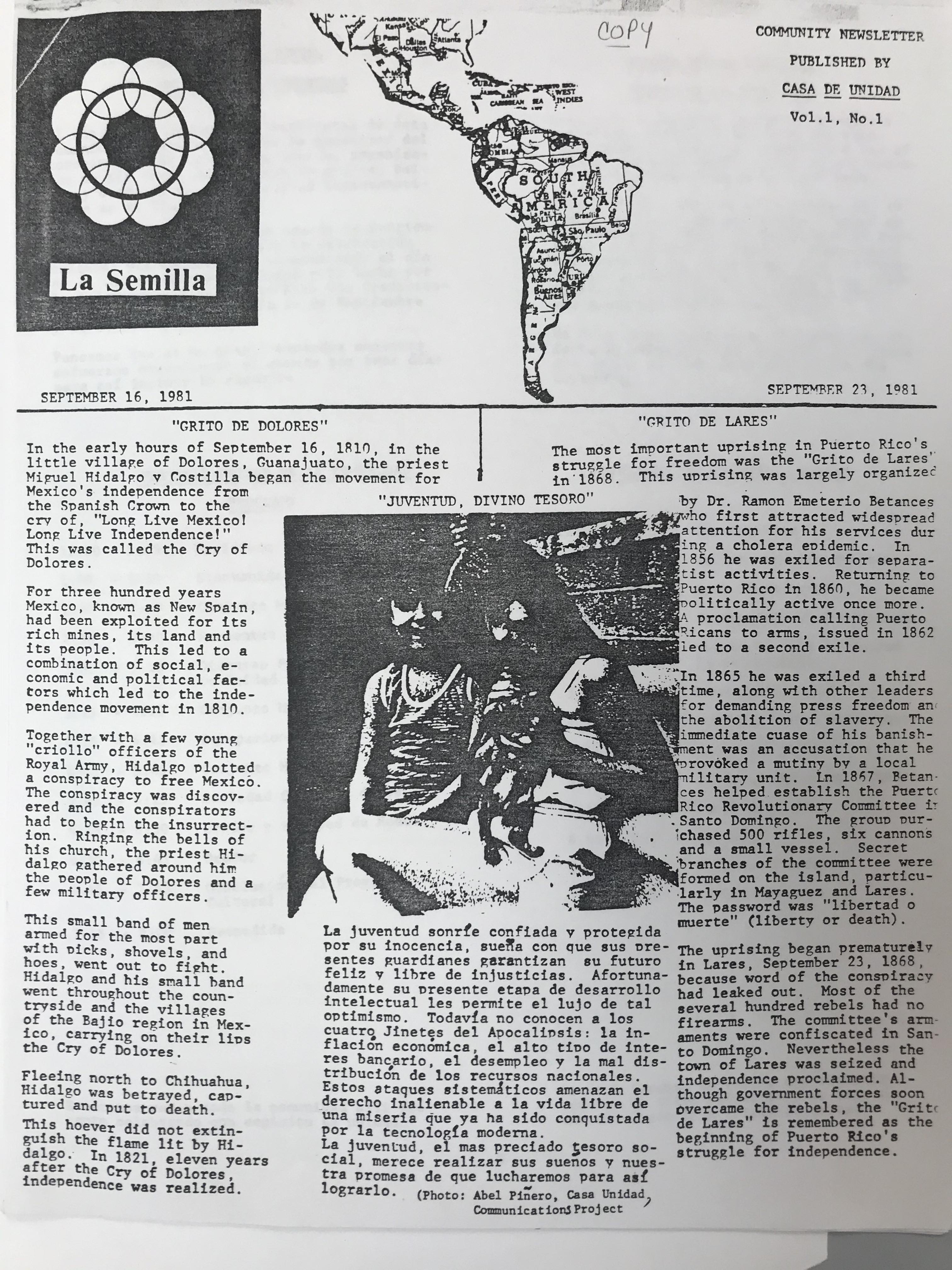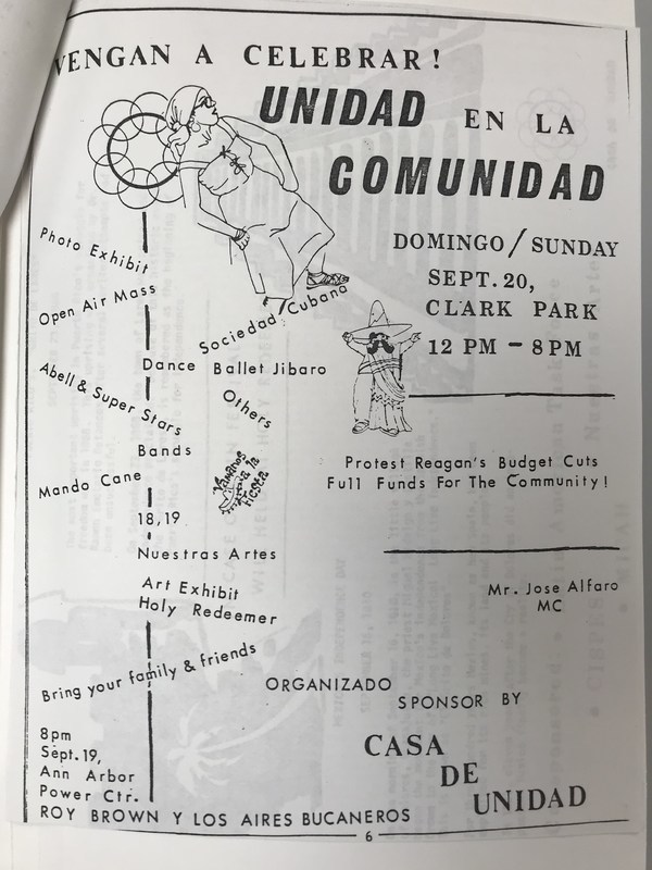 Finally, page 6 is a flyer for Casa de Unidad's Unidad en la Comunidad Festival which took place on Sunday, September 20, 1981 in Clark Park, Ann Arbor, MI. This family event showcased Latino arts & culture.
