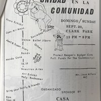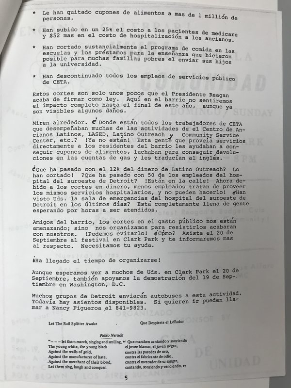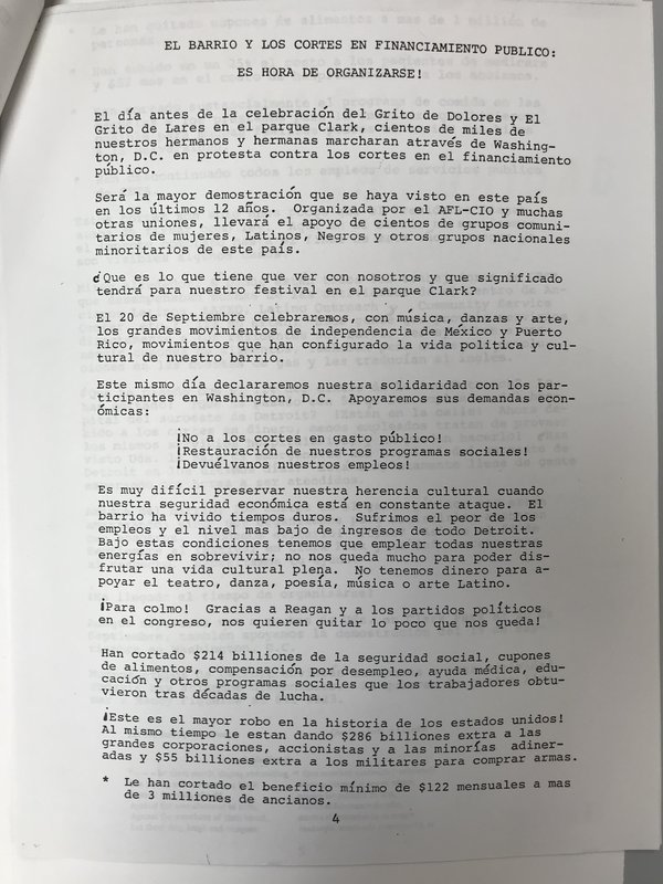 Community Newsletter. Page 3 and 4 are calling on Detroit's Latino community to be in solidarity with nationwide actions against Ronald Reagan's budget cuts. Specified are also solidarity actions taking place in Southeast Michigan such as Casa de Unidad's Unidad Festival taking place in Ann Arbor.