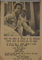 This image is the front of a poster calling out racial injustices within American court systems in the 1970s. It calls attention to the wrongful incarceration of Huey P. Newton, a political activist and cofounder of the Black Panther Party.