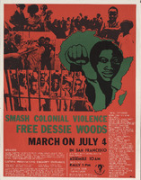 A poster titled "Free Dessie Woods". There is a call to meet at 10am on Baker and Fill st.. It contains a list of speakers who will be at the event as well as a list of sponors. In the background are multiple images. The first being police violence, where two police officers can be seen holding a battered looking Black man. There are also images that express solidarity and a mutual interest in achieving the goal to "Smash Colonial Violence"