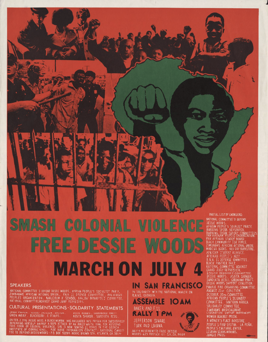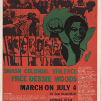 - A poster titled "Free Dessie Woods". There is a call to meet at 10am on Baker and Fill st.. It contains a list of speakers who will be at the event as well as a list of sponors. In the background are multiple images. The first being police violence, where two police officers can be seen holding a battered looking Black man. There are also images that express solidarity and a mutual interest in achieving the goal to "Smash Colonial Violence"