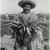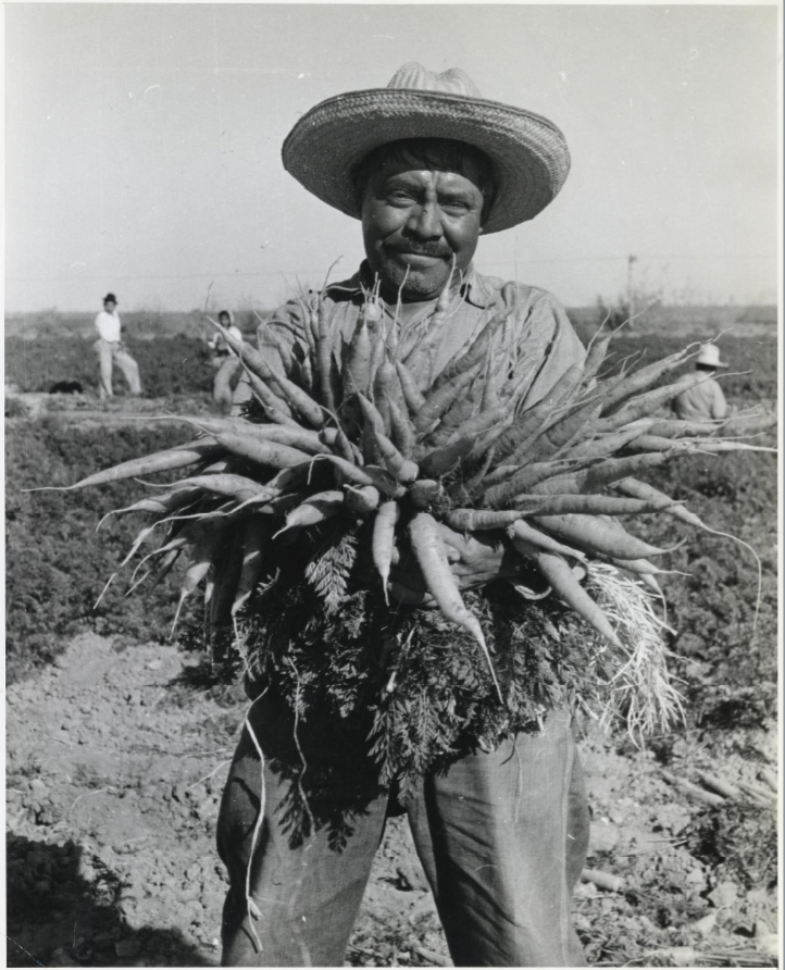 A Mexican worker most likely a Bracero showing his large harvest of carrots that help feed a nation during a time where production ran low Mexican Braceros stepped in to be the hands that fed the nation.