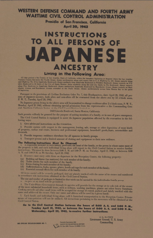 This poster was made in response to the Civilian Exclusion Order No. 75, which forcibly removed Japanese Americans regardless of citizenship status from their residences on the West Coast before they were incarcerated. This order was issued in 1942 during World War II.