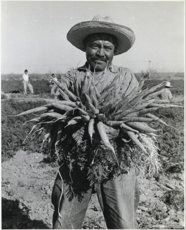 Here is a man proudly holding an enormous bundle of freshly harvested carrots, likely just one of many batches he gathered that day. Harvesting a batch like this took hours of bending, pulling, and carrying, and most workers repeated this labor four, 8 hours a day. During this period, many Mexican and other Latin American laborers were paid by the batch, meaning their wages depended entirely on how much they could harvest. They earned only a few cents for work that demanded intense physical strength and endurance, while growers made far more from selling the produce these workers picked by hand.