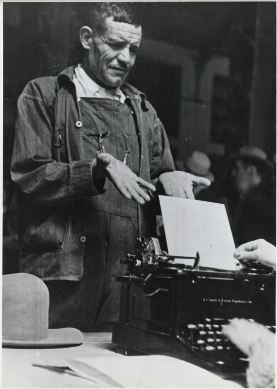 Here is a man in 1944 at the ranches hiring office showing his hands. Why may he be showing his hands at a jobs hiring office? His hands were his resume his only proof that he has lived a life of hard labor where is body bears the scuffs and toughness that has came with his labor.