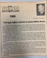 Parting Glances Column Column by Charles Alexander detailing the 1965 Gay Rights organized protest in front of the White House, including quotes from participants.