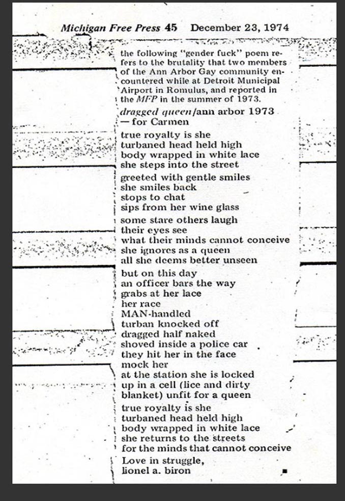 - Poem by Lionel A. Biron about brutality faced by two members of the Ann Arbor Gay community dressed in drag.