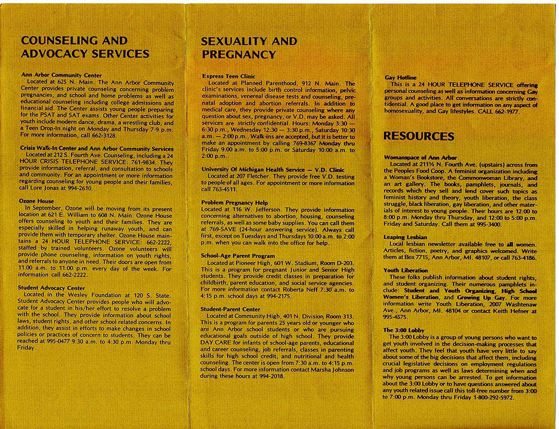 - Brochure created by Ann Arbor group Easy Access to Services for Youth (E.A.S.Y.) listing various support services. In the brochure, it lists contact information for a Gay Hotline and Leaping Lesbian, local lesbian newsletter.