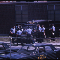DPL Description: "View of Detroit Police officers surrounding a police car parked at the Kiefer Command Post on the grounds of Herman Kiefer Hospital during the 1967 riots in Detroit. Handwritten on mount: 'Detroit riot. Kiefer Command Post.' "