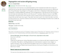 Tripadvisor review expressing disappointment with staff demographics at the Grand Hotel. Includes a response from the owners.