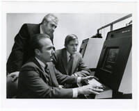 Photograph of Control Data executive meeting with Minnesota Commissioner of Corrections at PLATO terminal in Stillwater Prison. From source description: "Eugene L. Baker, VP Human Resource Management CDC; Kenneth E. Schoen, Commissioner of Corrections State of Minnesota (seated); Frank Wood, Warden (standing). Real/Time 1976 Volume 13 #4." -