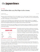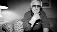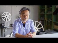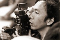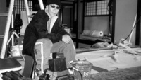 Black and white photograph of Takashi Miike sitting within the set for a film. The location is the interior of a Japanese style home and is in a state of construction.