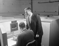Photograph showing electrical engineer and computer scientist Donald Bitzer, largely responsible for the creation of the PLATO system, assisting a student with the PLATO III Terminal