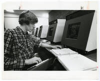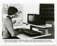 Photograph of a student using PLATO software on Atari 800, Texas Instruments 99/4A, Apple II Plus microcomputers. Caption reads: "October 19, 1982--Control Data Corporation, Minneapolis-based computer and financial services company, has just announced conversion of its PLATO software for use on Texas Instruments 99/4A, Atari 800 and Apple II Plus microcomputers. PLATO is a self-paced, highly interactive computer-based education system."