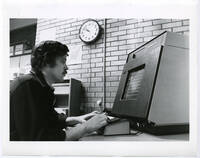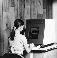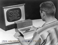 Photograph of student using an early PLATO terminal to solve a mathematical equation. From the original caption: "Teaching Machine developed in Coordinated Science Laboratory under Prof. Don Bitzer."