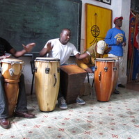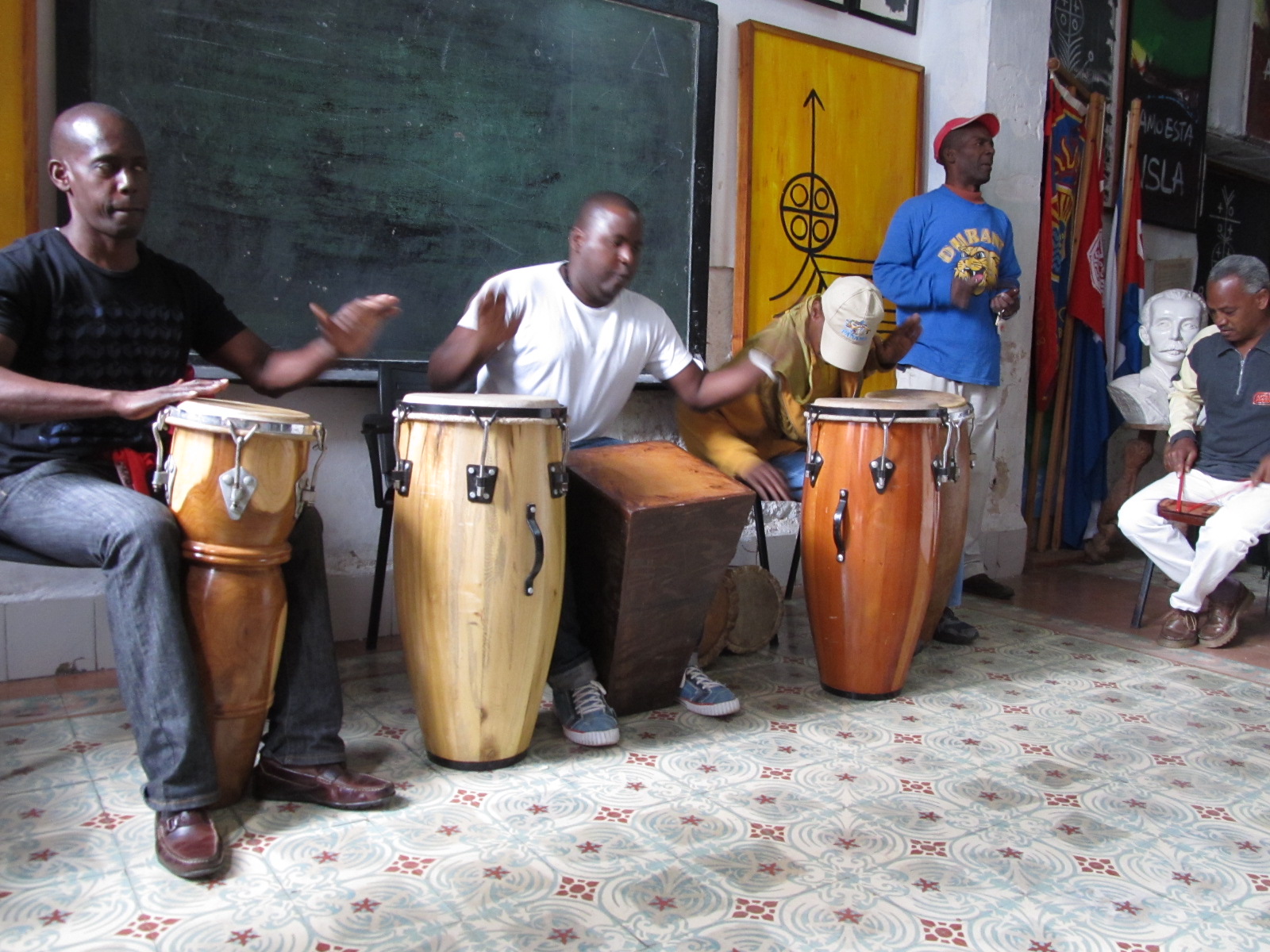 - Librado (r. out of frame), Kiki on cajon, Corominas (head down), Penton on clave, rehearsing with Oba Ilú in a space shared with Cabildo Quisicuaba in the Los Sitios neighborhood of Havana (2011).