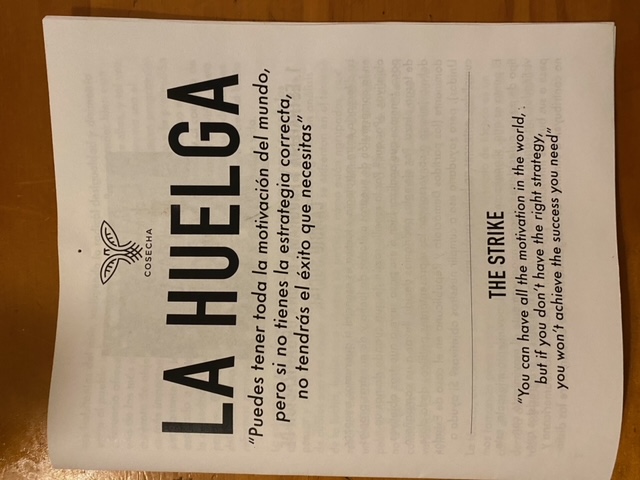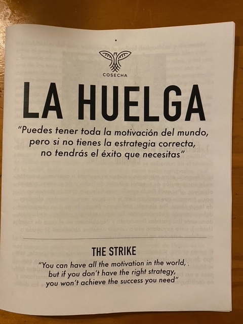 A booklet breaking down the nature of strikes and the strategy of Cosecha, the organization that created this booklet. The first half is written in Spanish, followed by an English translation in the second half.