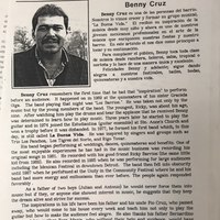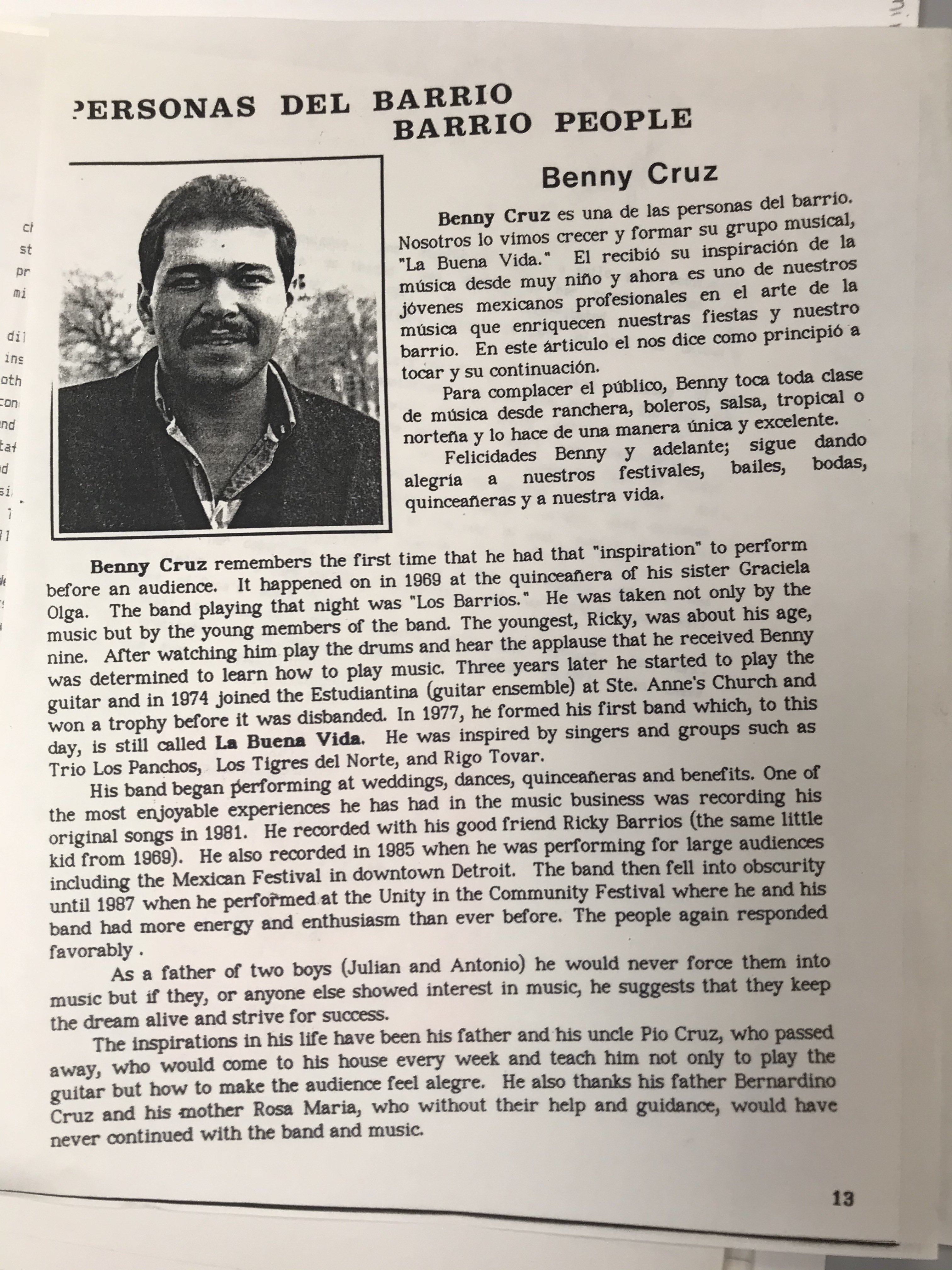 On page 13, "Personas del Barrio or Barrio People", local musician Benny Cruz is featured. His band "La Buena Vida" was formed in 1977 and played at weddings, quinceañera covers of Latino favorites such as Los Tigres del Norte or el Trio Los Panchos.