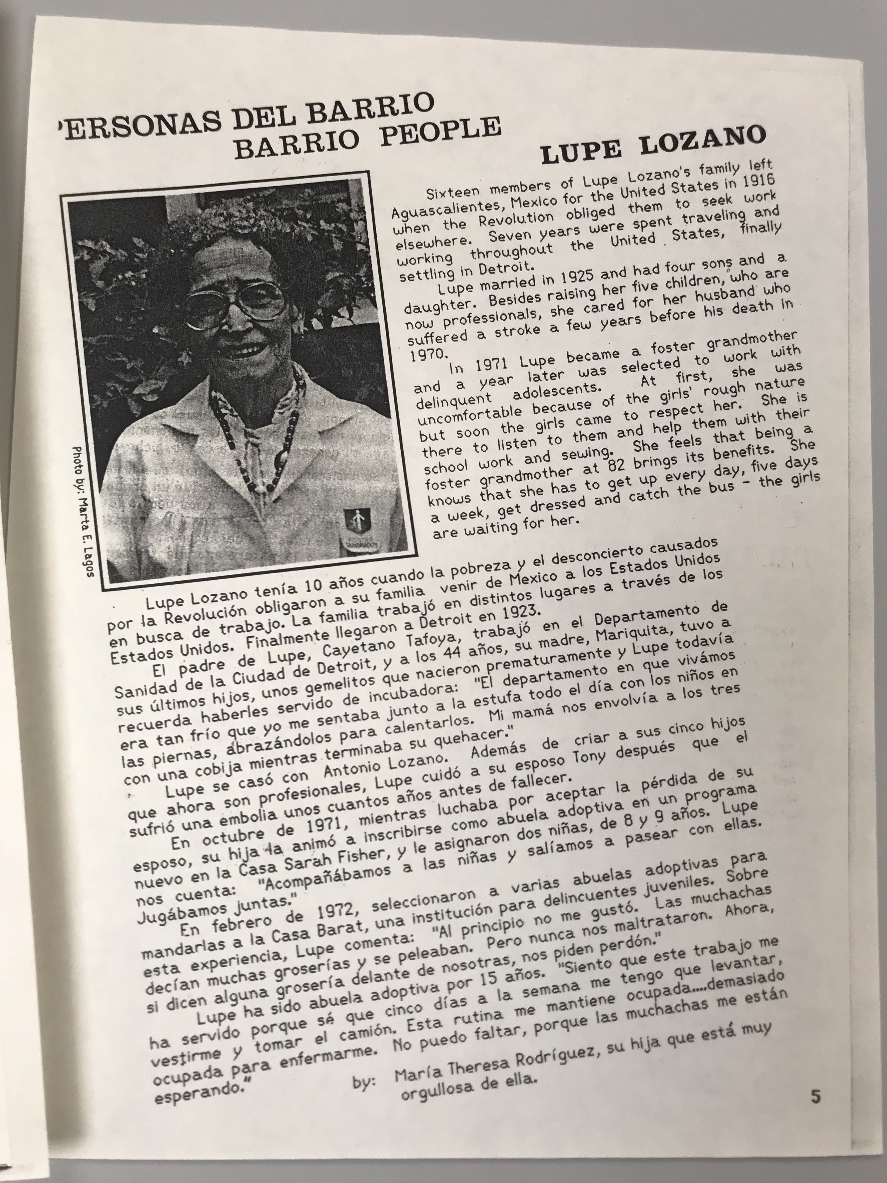 Page 5 features Lupe Lozano via a profile written by her daughter Maria Theresa Rodriguez. Lupe arrived to Detroit from Aguascalientes, Mexico in 1923.