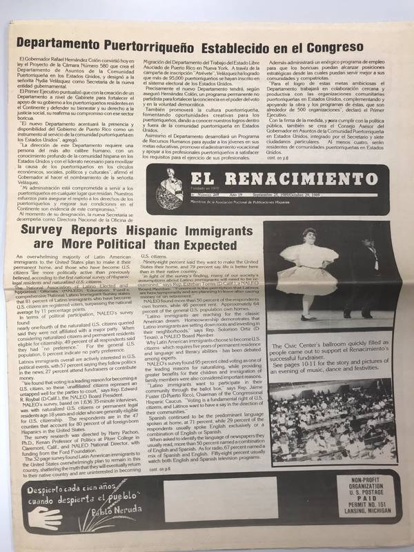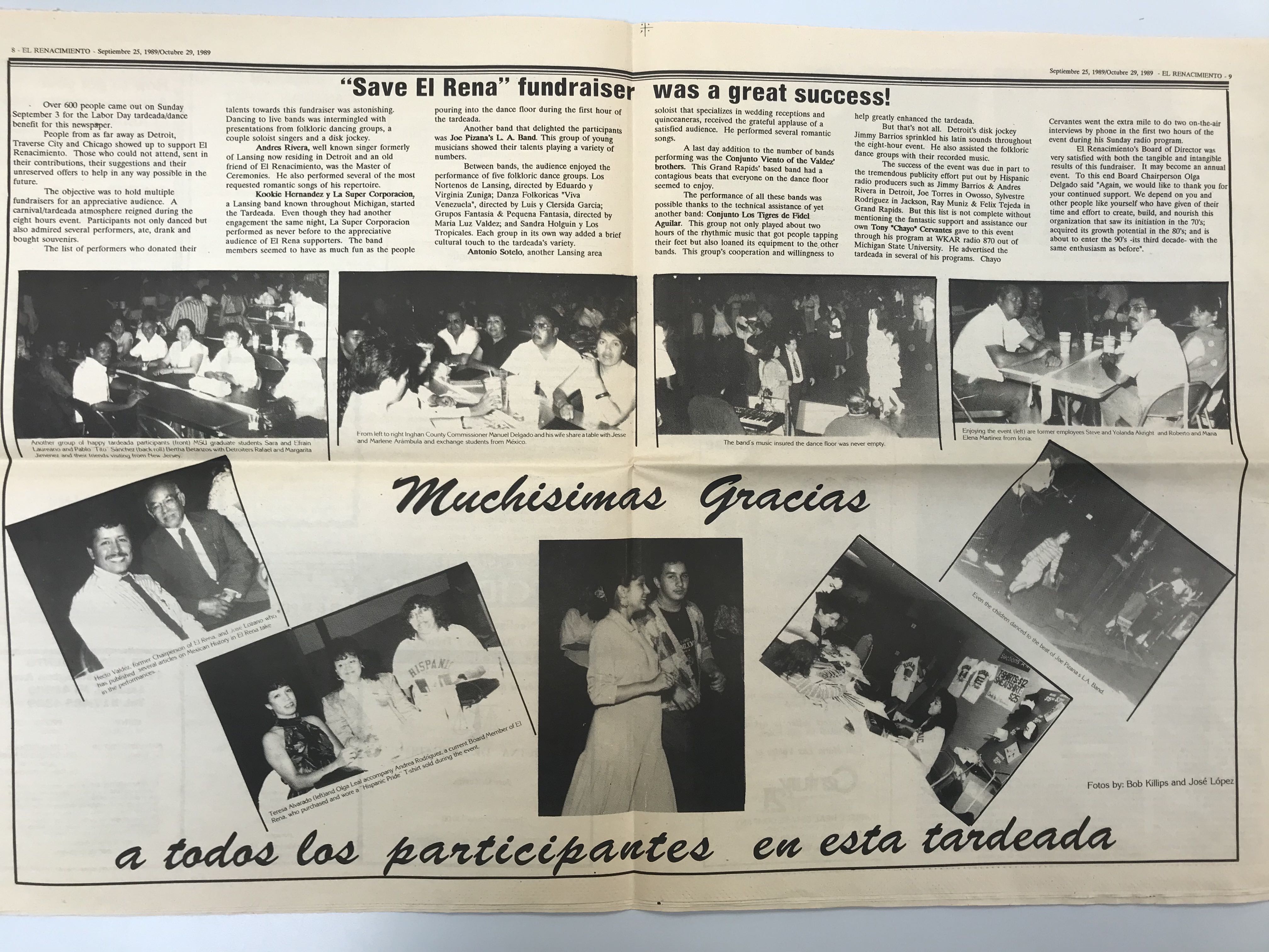 Page 8-9 features El Renacimiento's fundraising efforts on September 3, 1989 to keep the newspaper running.