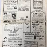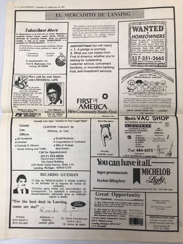 A monthly Spanish language newspaper for Lansing's Latinx community. Front page articles are in English and Spanish. This page titled "El Mercadito de Lansing" features ads of Latino small businesses in Lansing.