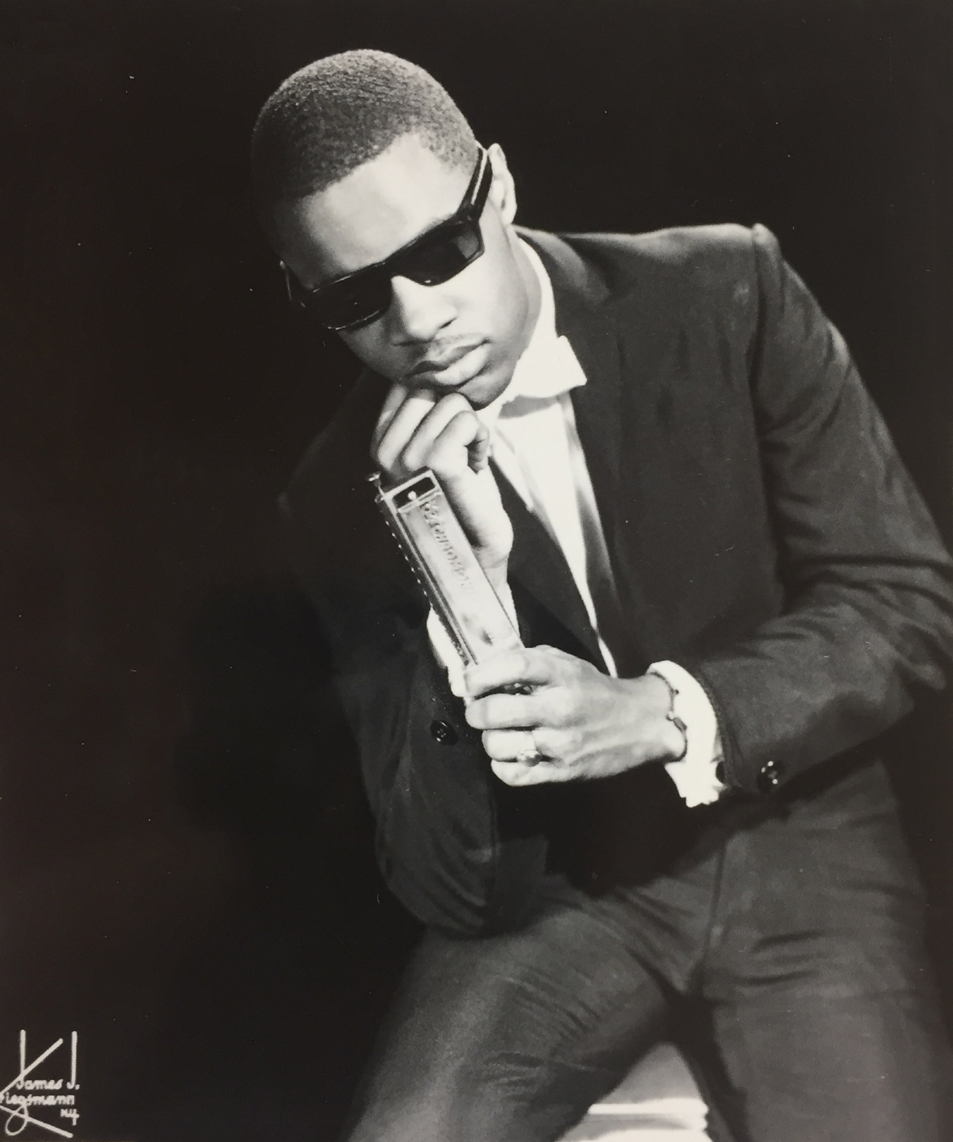 - Stevie Wonder sits with his harmonica in a pensive promotional shot
