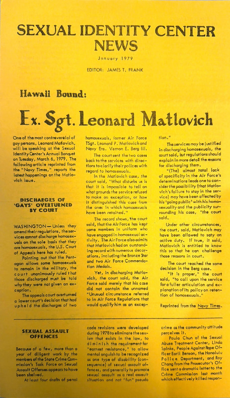 A newsletter featuring a reprinted article about a US Court of Appeals case in Washington D.C. that bans the discharge of LGBTQ+ service members on the basis of sexual orientation alone.