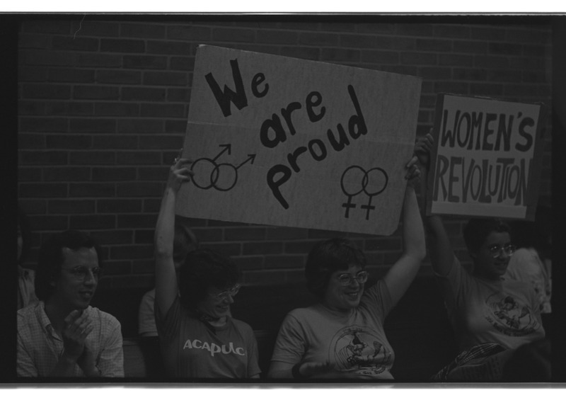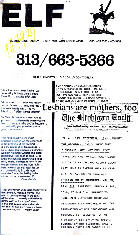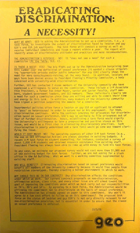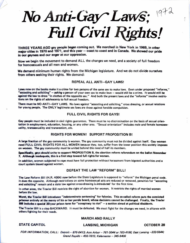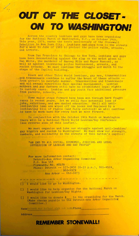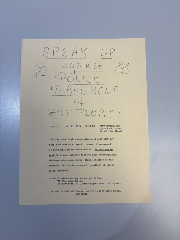 Flyer urging members of the Ann Arbor, Michigan community with knowledge of police harassment of gay people to provide testimony before the city’s Human Rights Commission on July 25, 1974.