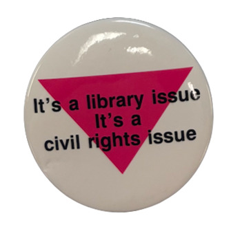 One circular button that measures 2 inches diameter. It is composed of a metal disc covered in a protective layer of celluloid, and a pin backing. The face is white with an inverted pink triangle and black text that reads, "It's a library issue It's a civil rights issue."